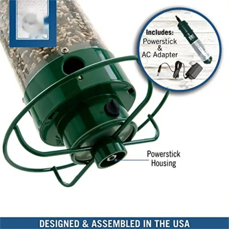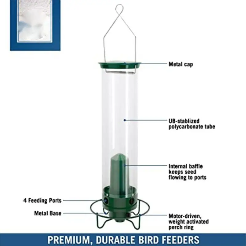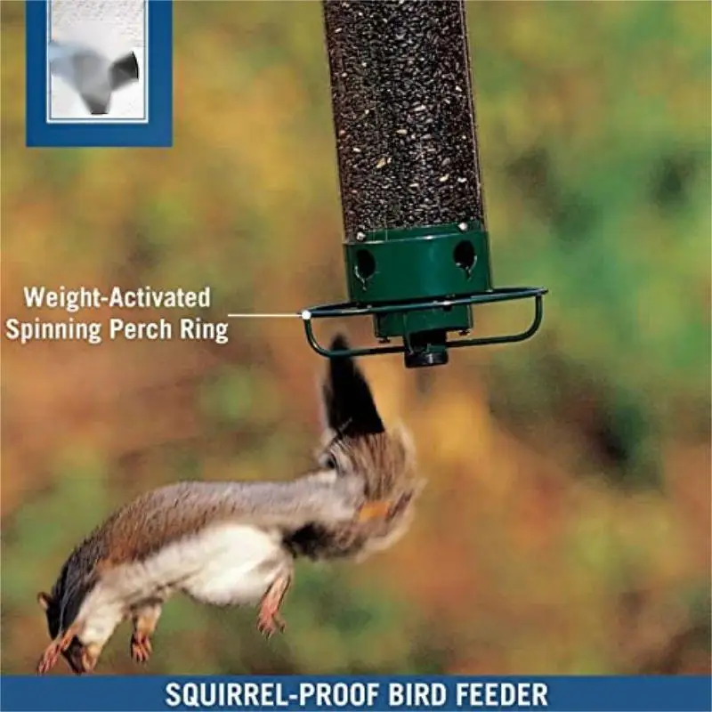 The squirrel-proof design is centered around a spinning perch. When a squirrel tries to gain access to the feeder, the weight-sensitive perch activates the motor. The spinning action then gently tosses the squirrel off before it can devour your seed supply. In addition, the tight-fitting metal cap prevents squirrels from lifting the lid, while the long seed reservoir prevents them from reaching the ports from above.